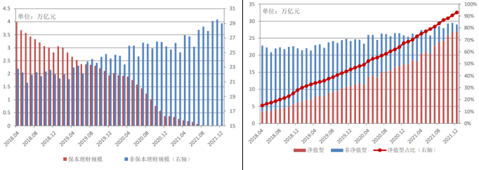 ??根據(jù)銀行理財?shù)怯浿行陌l(fā)布《中國銀行業(yè)理財市場年度報告(2021)》相關(guān)數(shù)據(jù)顯示,截至2021年底,共301家銀行機構(gòu)和21家理財公司存續(xù)有理財產(chǎn)品3.63萬只,存續(xù)規(guī)模約29萬億元,其中保本型銀行理財產(chǎn)品規(guī)模實現(xiàn)清零。另外隨著老產(chǎn)品的持續(xù)壓降和新產(chǎn)品的不斷發(fā)行,銀行理財產(chǎn)品凈值化程度持續(xù)提升,截至2021年底,凈值型理財產(chǎn)品余額26.96萬億元,占比92.97%,較資管新規(guī)發(fā)布前增加23.89萬億;非凈值產(chǎn)品余額為2.04萬億,較資管新規(guī)發(fā)布前減少16.39萬億。