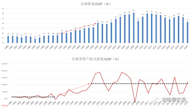 兩個世界合并后,隨著美元重拾霸權,經(jīng)濟全球化也得到快速推進。以全球貿(mào)易為例,在前蘇聯(lián)解體的1991年,全球貿(mào)易/GDP為38%,到1997年達到45%。與經(jīng)濟全球化相比,金融全球化的步伐更是令人驚嘆,而金融全球化的突出表現(xiàn)就是跨境資本流動的速度迅速加快。僅以資產(chǎn)組合投資的凈流動規(guī)模為例(圖2)。在1990年前,全球凈金融資產(chǎn)組合投資的規(guī)模平均為全球GDP的1.3倍,1990年后快速上升,從1998年迄今,凈金融資產(chǎn)組合投資的平均規(guī)模已經(jīng)是全球GDP的將近11倍——這還僅僅是金融資產(chǎn)組合投資的凈值,如果是全部資產(chǎn)組合投資的話,那將是全球GDP的百倍以上。