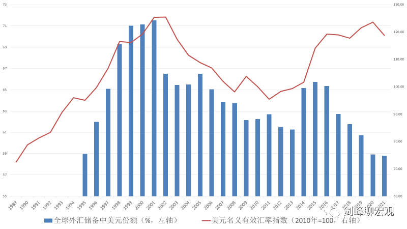1989年,柏林墻被推倒,經(jīng)互會走向瓦解,美元由此滲透到曾經(jīng)的東方世界。同年,美國的凈國際投資頭寸轉(zhuǎn)變?yōu)橛谰眯缘呢撝?,通過貿(mào)易逆差和累積對外美元負債來向全世界傾瀉美元流動性成為美國的特權。1990年,曾經(jīng)一度希冀通過日元國際化來挑戰(zhàn)美元霸權的日本發(fā)生了嚴重的房地產(chǎn)泡沫危機,并在此后陷入長期停滯。兩個挑戰(zhàn)者相繼失敗之后,美國開始引領信息技術革命,這使得美元在整個90年代都處于強勢上升態(tài)勢。1989年,美元名義有效匯率口指數(shù)為72,到2001年信息技術泡沫破裂時達到125。與此同時,美元在全球外匯儲備中的份額也快速上升,1995年美元占比為59%,到2001年達到72%,遠高于同期美國GDP和貿(mào)易占全球的份額(分別為24%和14%)。