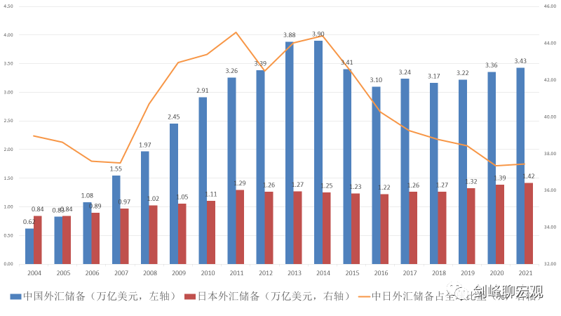 以中國和日本兩個最大的亞洲經(jīng)濟體為例。2007年后,中國和日本分列全球外匯儲備規(guī)模第一大和第二大國家,兩國外匯儲備在2013年最高時相當于全球外匯儲備的44%。2013年后中國外匯儲備規(guī)模有所下降,但直到2021年中日外匯儲備占全球的比重依然高達37%。雖然沒有關于中日外匯儲備具體幣種構成的數(shù)據(jù),但從美元在全球外匯儲備的份額就可以知道,其中大部分都是美元。在1990年泡沫經(jīng)濟危機和1997年亞洲金融危機之后,日元在國際貨幣體系中的地位江河日下,而人民幣在2015年匯改之前事實上一直是盯住美元。隨著中國崛起為整個亞太經(jīng)濟圈的中心樞紐,這就導致整個亞太地區(qū)的貨幣通過人民幣形成間接盯住美元的亞洲美元體系——這一體系也被稱作“后布雷頓森林體系”。