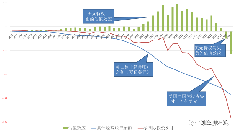 如果凈國際投資頭寸大于累積經(jīng)常賬戶余額,對外凈資產(chǎn)的估值效應就大于零。當該國是對外凈負債的時候,這就意味著由于該國持有的對外凈資產(chǎn)的升值,該國實際的對外凈負債要小于通過經(jīng)常賬戶逆差積累的負債,該國即享有貨幣特權——通過經(jīng)常賬戶逆差分享他國經(jīng)濟果實、同時又不用承擔過度債務的特權。