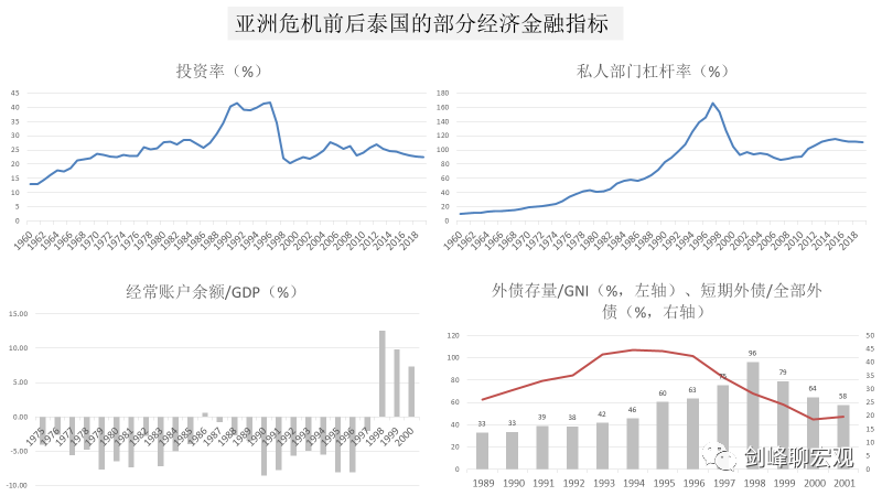 泰國是最先陷入亞洲金融危機,也是亞洲國家中最先實施激進的金融自由化改革的國家——即使是作為當時亞洲第一大、全球第二大經(jīng)濟體的日本,也只是遲至1996年橋本龍?zhí)缮先问紫嗪蟛磐瞥鋈毡景姹镜慕鹑诖蟊ǜ母?。以泰國為例,在國?nèi)裙帶資本主義弊端還未根除的時候,1992年泰國匆忙放開了對資本金融賬戶的管制,美元流動性迅速向泰國國內(nèi)傾瀉。1992年,泰國外債/GNI為38%,到1997年飆升到75%。在飆漲的外債中,超過40%是短期外債。外債的流入推動了國內(nèi)信用擴張,私人部門杠桿率從1989年的72%飛躍到1997年的167%。國內(nèi)信用擴張又導致國內(nèi)投資熱潮,本來就很高的投資率在1994至1996年三年間一度超過了40%。